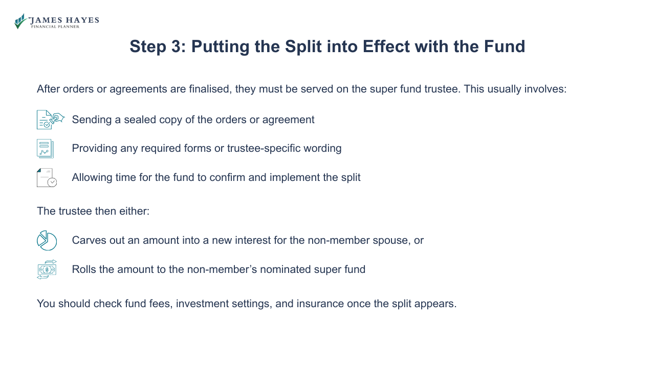 After orders or agreements are finalised, they must be served on the super fund trustee. This usually involves: